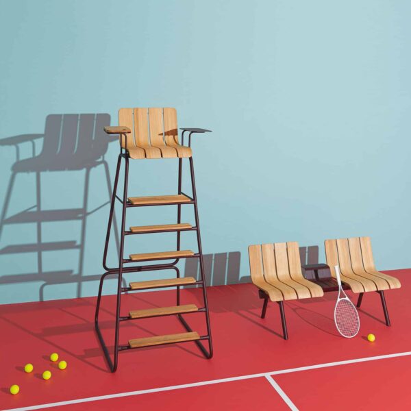 Design Patrick Norguet. La chaise d’arbitre Ace est composée d’une structure en aluminium (4 coloris disponibles) avec une assise et un dossier en alu ou en teck. Nous consulter.