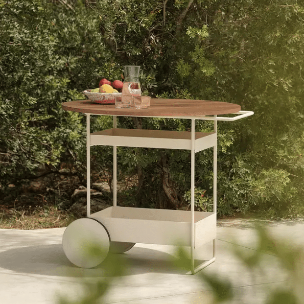 Designer Alberto Lievore. Collection Ninfea. Desserte roulante en aluminium avec plateau en iroko rabattable. Grand choix de coloris. Nous consulter.