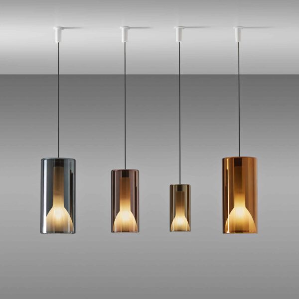 Designer Umberto Asnago. Collection Lit. Suspension composée de verre métallisé. Lampe LED. 2 hauteurs et 3 dimensions disponibles. Nous consulter.